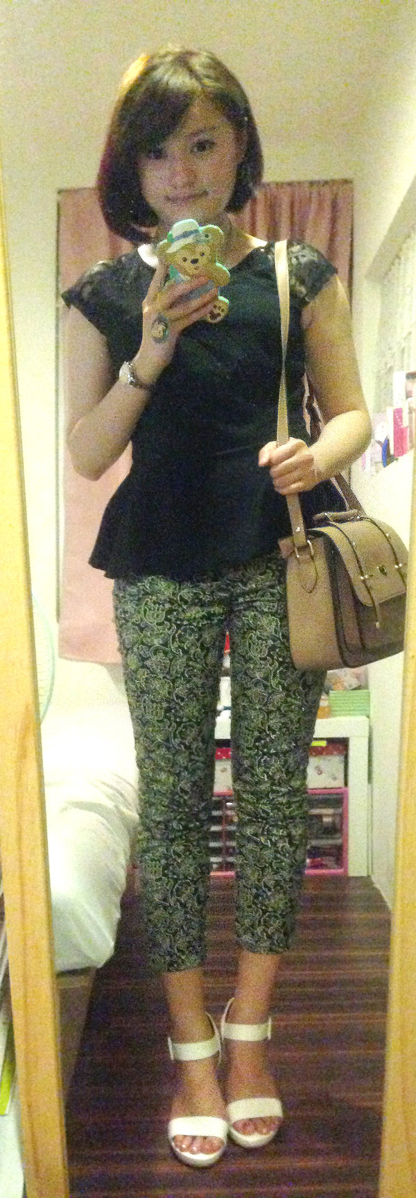 黑色蕾絲上衣/卡其色背包-NET